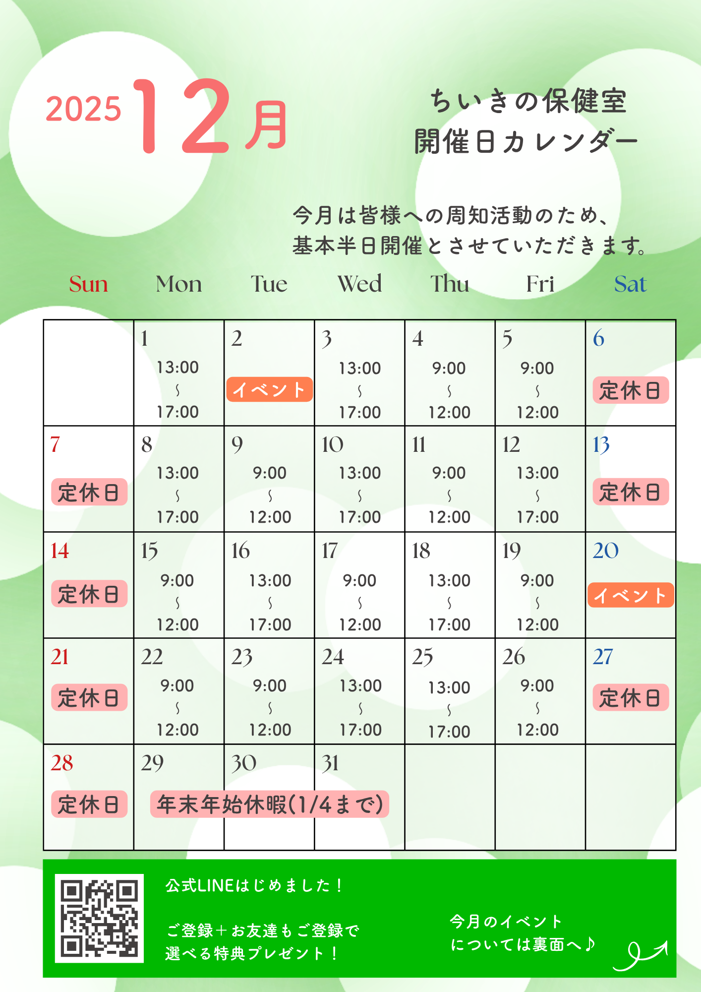 2025年12月の開催日カレンダーが完成しましたのでお知らせいたします。
