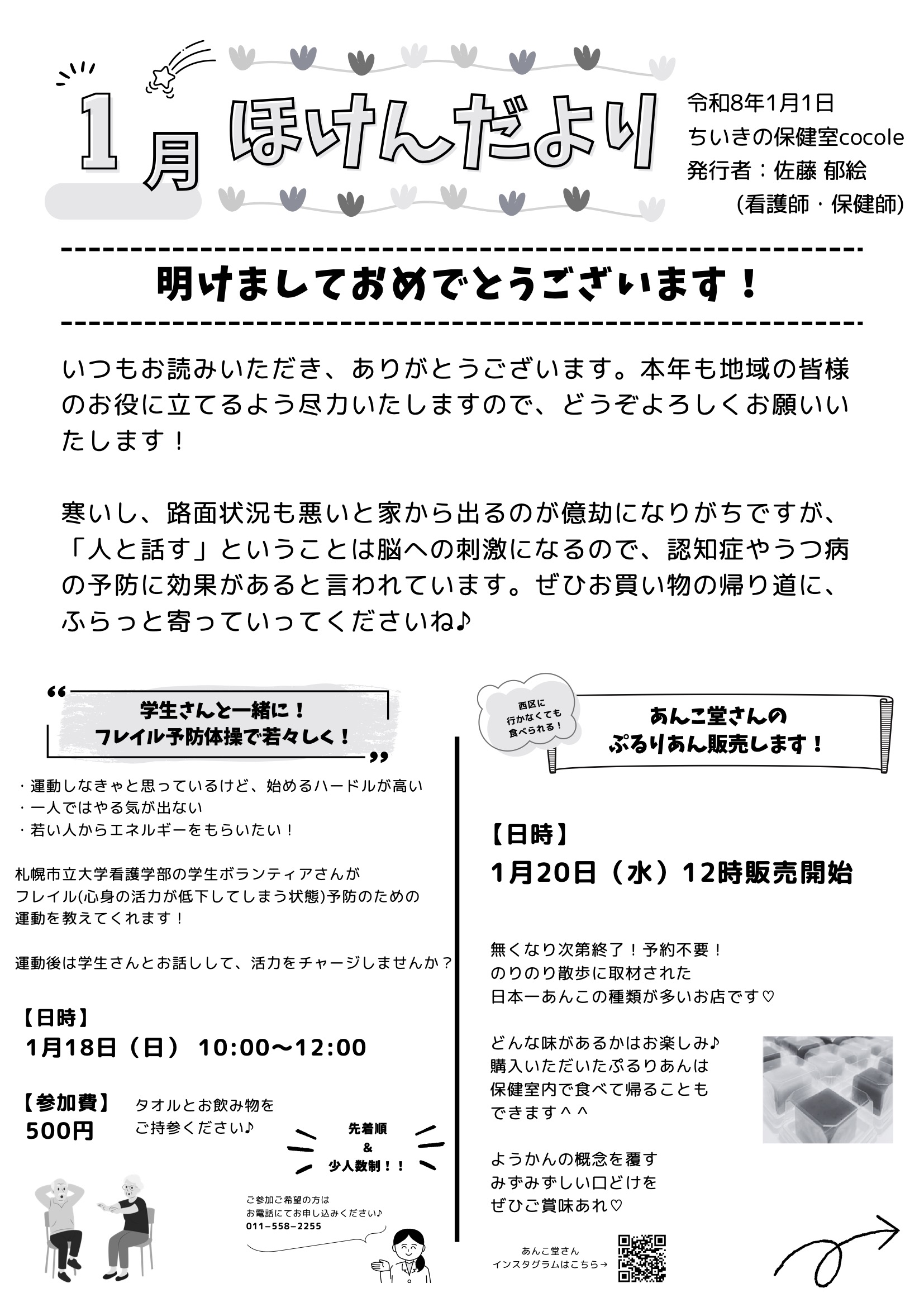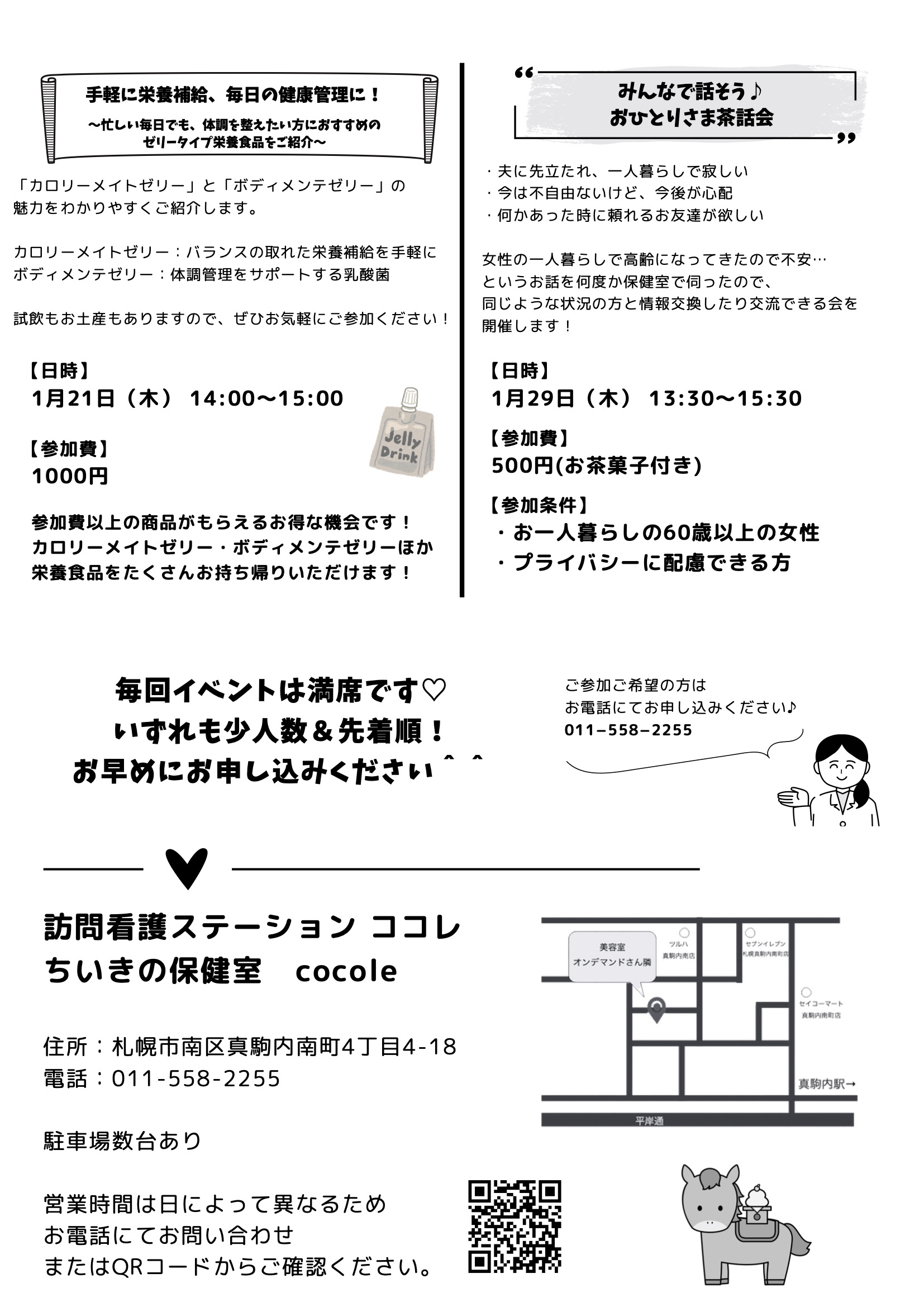 ちいきの保健室 cocole では、1月に向けていくつかのイベントをご用意しています。気になるものがあれば、ぜひお気軽にお申し込みください。